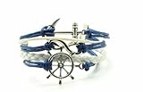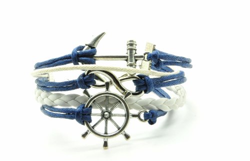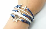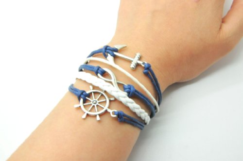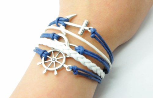 Navy Blue Rope and White Braided Leather Steampunk Adjustable Vintage Silver Karma Bracelet,infinity Wish Anchor Rudder Bracelet 1150r by Retro Bracelet