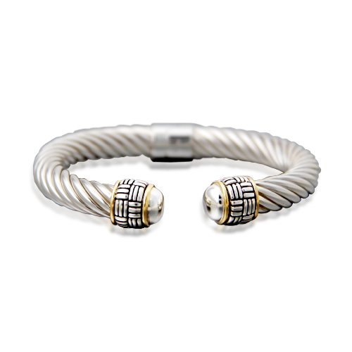 DescriptionGown up your wrist with this rope twist cuff bracelet, common in sterling silver with gold-tone accents. A basketweave pattern at the cabochon ends lends attention-grabbing texture and contrast.