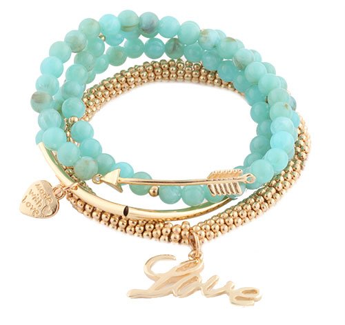 Ladies Gold with Turquoise “Made with Love” Style Love, Heart, Arrow Charms Beaded Stretch Bundle Bracelet by JOTW