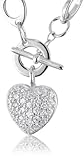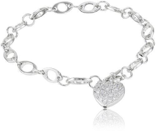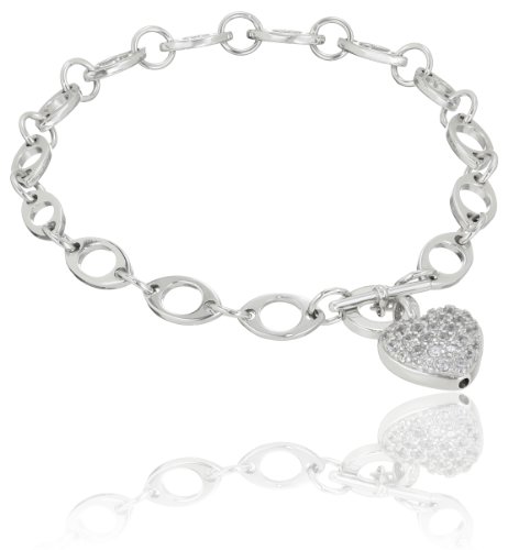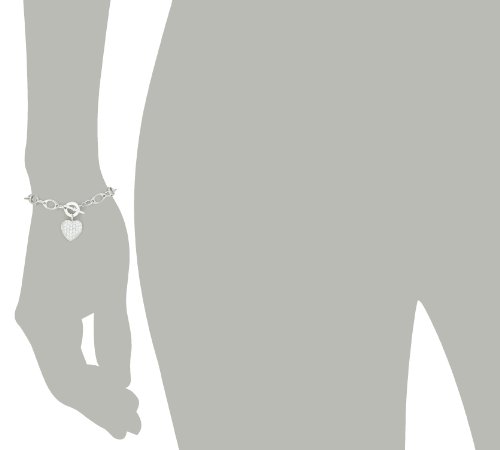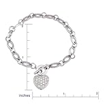 DescriptionThis trendy Heart bracelet is comprised of rhodium-plated sterling silver and shimmering cubic zirconia. The distinctive, stylish design includes a thick, brightly polished chain that fastens with a toggle clasp. A sparkling cz-studded Heart, with a slight puff form and a filigree back, dangles from the clasp.
