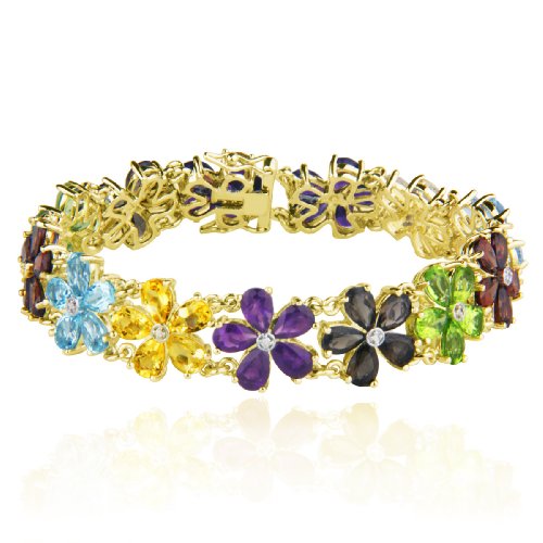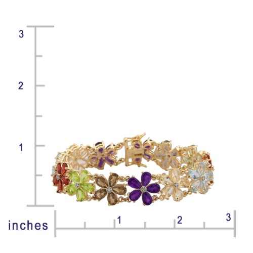 DescriptionThis multi-gemstone flower bracelet is a colorful garland for your wrist. Original in brilliant gold-dipped sterling silver, it links shiny flower shapes with petals constituted of six standard Gemstones: deep purple garnet, sky blue topaz, golden citrine, red amethyst, smoky quartz, and light green peridot. The 7 1/Four-inch bracelet is finished with a standard box clasp and double security latches.