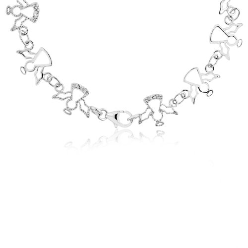 DescriptionPretty link bracelet showcases lovely little textured and diamond accented angels. Jewellery is crafted of fine sterling silver with a highly polish end. Secures with a lobster claw clasp.