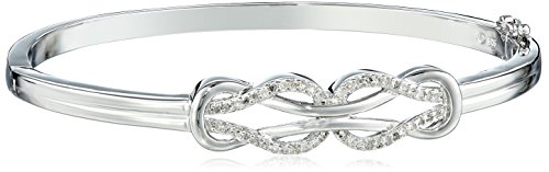 DescriptionThe figure-eight shaped knots on this diamond-accented bangle bracelet signify the eternal bonds of love and friendship, making this bracelet an especially meaningful gift choice.^Crafted in .925 sterling silver^All our diamond suppliers certify that to their best knowledge their diamonds are not conflict diamonds.^The total diamond carat weight listed is approximate. Variances may be up to .03 carats.^Imported Editorial ReviewThis double infinity loop bangle bracelet is crafted in polished sterling silver and embellished with 1/4 carat of genuine diamond accents. It has a hinged design with a box clasp and safety latch for an easy on and off. The figure-eight shaped knots symbolize the eternal bonds of love and friendship, making this bracelet an especially meaningful gift choice.