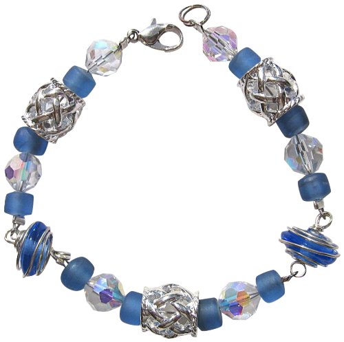 Massive silver toned intricately laced spacers with wire wrapped blue glass beads, 6mm frosted blue rondels and Swarovski iridescent crystals with silver toned lobster claw clasp. This bracelet is 7 half of inches lengthy from tip to tip and is made with Flex-ceremony Forty Nine strand nylon lined stainless steel micro wire for flexibility and sturdiness. This bracelet is hand crafted.