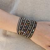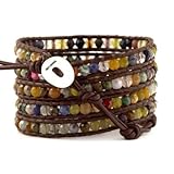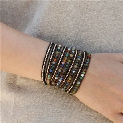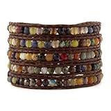 Description5 wrap bracelet with Multi Stone semi valuable stones on brown colored Leather. Sterling silver Chan Luu engraved button with 3 adjustable closures that measures 32″ / 33″ / 34″ in size BS-1289WEBMUL