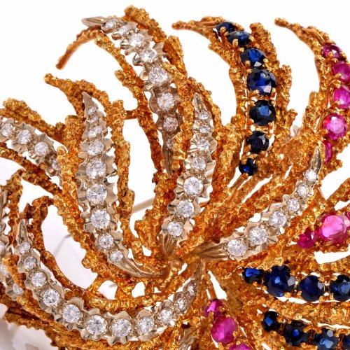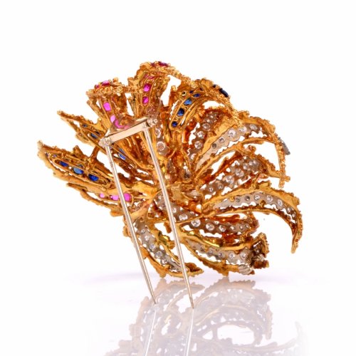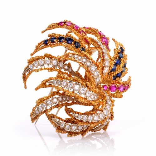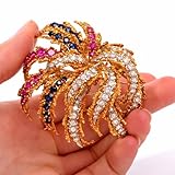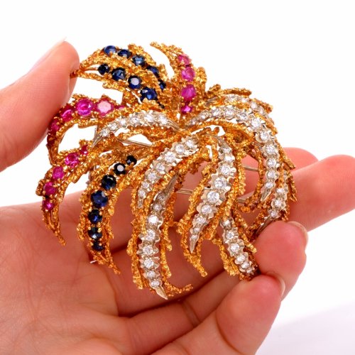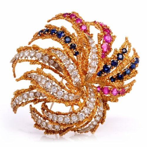 Vintage 13.48cts Burma Ruby & Sapphire Diamond 18k Gold Firework Pin by Dover Jewelry