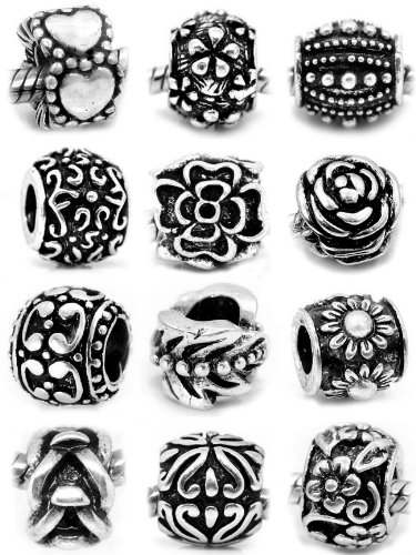 Ten (10) Silver Assorted Flower and Pattern Design Beads Charm (Styles You Will Receive Are Shown in Picture Assorted Random Mix 10 Beads) for European Style Bracelets Fits Pandora, Biagi, Troll, Chamilla and Many Others by Pro Jewelry