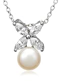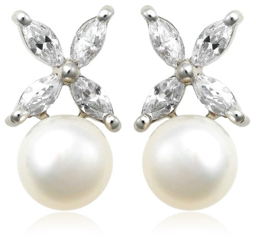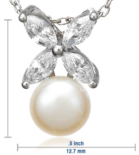 Platinum overlay offers this sterling silver pearl pendant and earring set a lovely bright shine that resists tarnish. White freshwater cultured pearls are topped with floral quartets of sparkling clear cubic zirconia on this based design. The small pendant is showcased on an 18-inch oval hyperlink chain, and the Rings are finished with posts and friction backings. This matching set will dress up any outfit, and it makes a stupendous gift.