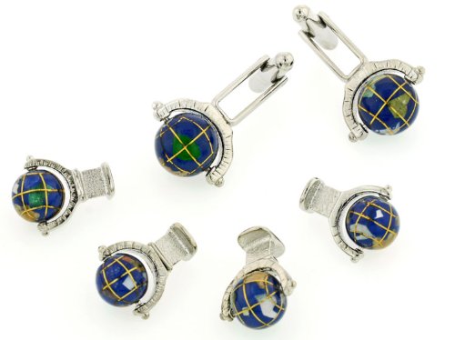 DescriptionSilver plated cufflinks and shirt studs formal set with handpainted spinning globes. This Is an improbable formal set and being that the globes are hand painted no two are going to be the same which gives everything that distinctive touch! The setting of the cufflinks has a textured effect with markings as you would see markings around a large globe to determine the degrees etc. You Can't do it on these clearly, however all a part of the fun design! Presentation boxed. Made in the USA