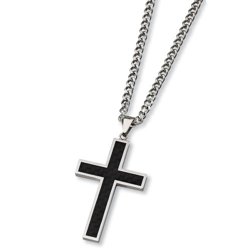 Black Carbon Fiber and Polished Stainless Steel Cross Necklace on 24 Inch Chain by West Coast Jewelry