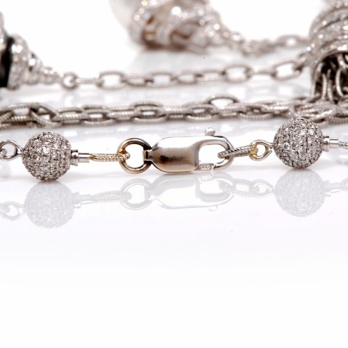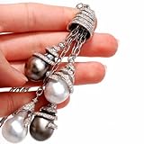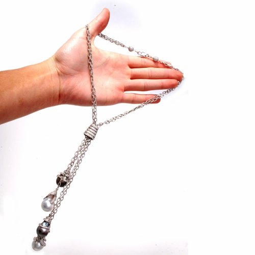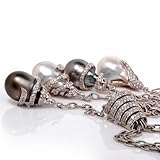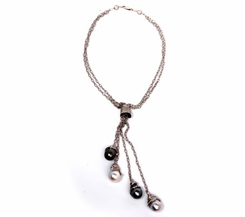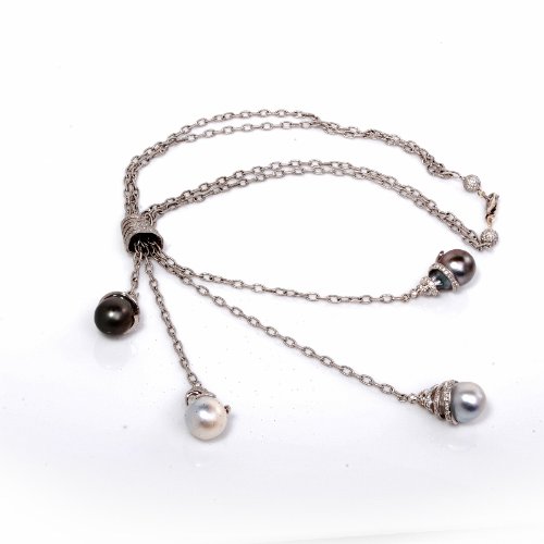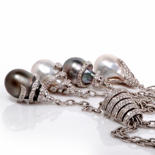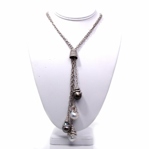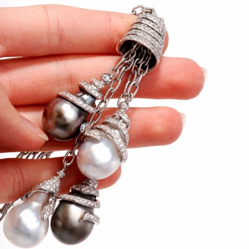 DescriptionThis extravagant necklace is crafted in strong 18K white gold. This incredible piece shows 4 strands of hyperlink with 4 diamond pearl drops and drop are coated with approx. 630 actual round lower diamonds approx 17.35cttw, H color, VS clarity, all pave set. These lustrous south-sea pearls are in numerous colour.(to off white, silver gray and black gray south sea pearls. This pendant necklace comes with a security clasp and continues to be in excellent wearing condition! * The Length of the each drops can also be adjusted. This necklace comes with a certified appraisal for the amount of:$34500.00