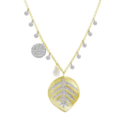 DescriptionGorgeous leaf necklace with pave diamond disc accent and diamond bezel charms. Meira T loves nature as this necklace is galvanized through nature.