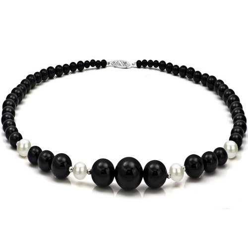 4-16mm Graduated Black Onyx and 8-9mm White Cultured Freshwater Pearl Necklace 18″ length with 3mm Sterling Silver Beads and Filigree Clasp. by La Regis Pearl & Gemstones