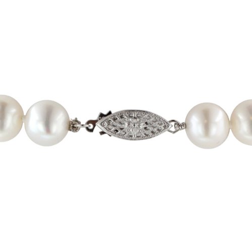 DescriptionDeliver the look of lustrous class with the reward of the White Freshwater Cultured Pearl Necklace with Sterling Silver Clasp. This 18-inch strand consists of 9-10mm off-round freshwater cultured pearls. The pearls are harvested with good uniformity and a good luster score. Hang-strung for quality, this princess-length strand fastens with a sublime pearl and security clasp.