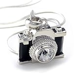 Silvertone Miniature Black Crystal Camera Pendant Necklace 18″ by PammyJ Necklace