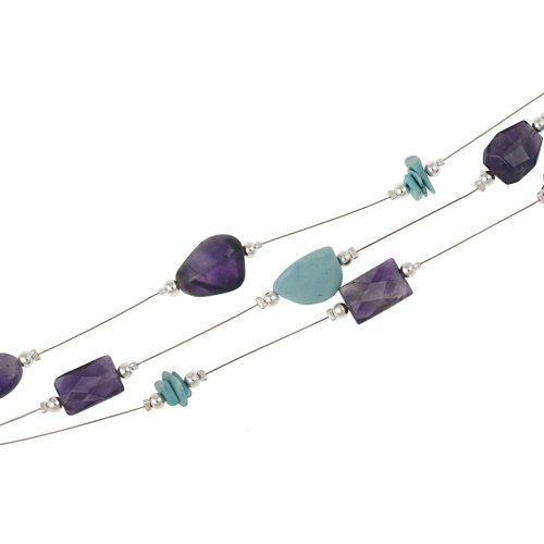DescriptionEasy yet based, the Sterling Silver and chrome steel Three Row Phantasm Turquoise and Amethyst Necklace is certain to start conversations and invite admiration. Amethyst and turquoise gems of various shape, measurement, and colorations of blue and red work in cohesion and are unfold evenly over three chrome steel and 925 silver strands. This piece gives the impression of lovely violet and blue-coloured gemstones, hovering around your neck, defying gravity. The necklace is Sixteen-inches long with an not obligatory three-inch extender, and connects securely on the again with a convenient lobster-claw clasp.