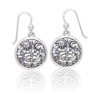 Ancient Tree of Life with Sun and Moon Symbol Round Filigree Sterling Silver Earrings by Silver Insanity