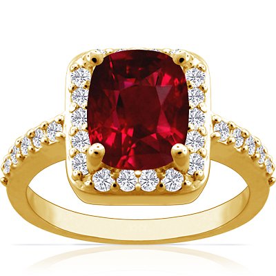 DescriptionThis extremely stylish halo ring comes precision set with thirty spherical pave set diamonds with complete weight of 0.60cts. surrounding a 4.07ct. cushion ruby. The Ruby has pigeon blood red color, eye clarity and excellent brilliance. This item is manufactured in AMERICA.