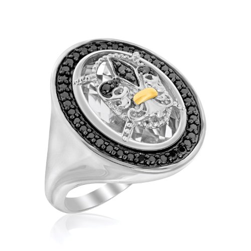 DescriptionExuding traditional magnificence, this black crystal embellished oval ring showcases a fragile fleur de lis center detailing. Crafted in rhodium finished sterling silver and 18K yellow gold, that is available in sizes 7 to 9.