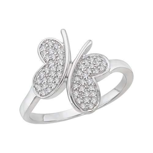 DescriptionOur fancy butterfly ring is a feminine satisfaction designed with shimmering diamond accent wings. The Very Best present. Casted in sterling silver this pretty butterfly ring has Fifty Two diamonds of 0.20 ct. (Tw.).