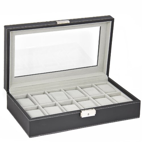 Watch Box Large 12 Mens Black Leather Display Glass Top Jewelry Case Organizer by 24/7 Value
