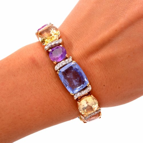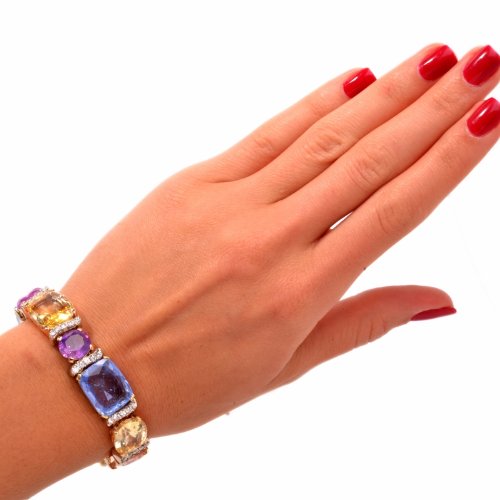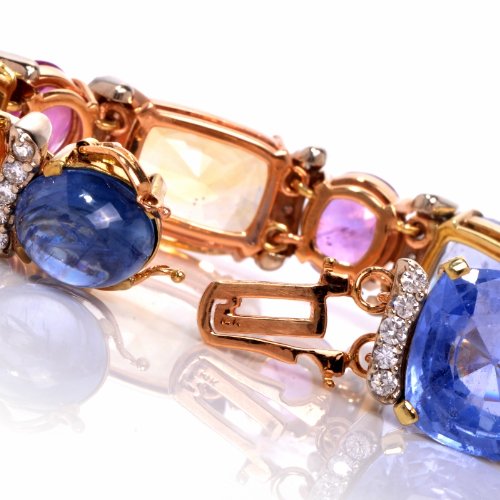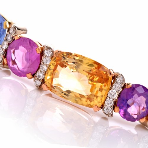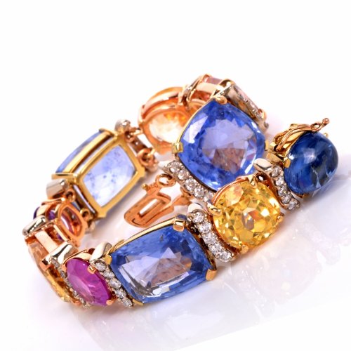 DescriptionBeautiful female hues will beautify your wrist with this exquisite multi-gemstone bracelet, a colorful and pleasant addition to any jewelry collection! Finely crafted in stable 18K yellow and crimson gold, it Features a charming design that is accented with a lot of Pure unheated sapphires (blue, yellow and pink) all in Natural state with none warmth treatment. The Entire approx. carat weight of the gemstones are 131.28ct. (please note Ninety Nine% of all sapphires are heated beneath extreme warmth and drive to increase its Color tone). The soothing tones are accented with a complete of fifty genuine round lower diamonds approx. 2.43 ct, H-I Color, VS readability. This stunning bracelet is full with an insert safety clasp and remains in very good condition!! Weight is approx: 63.Three Grams Width/Top is approx: 14mm x 10mm Wrist Dimension measures approx: 6″ This item has been professionally appraised for within the amount of: $ 64000.00